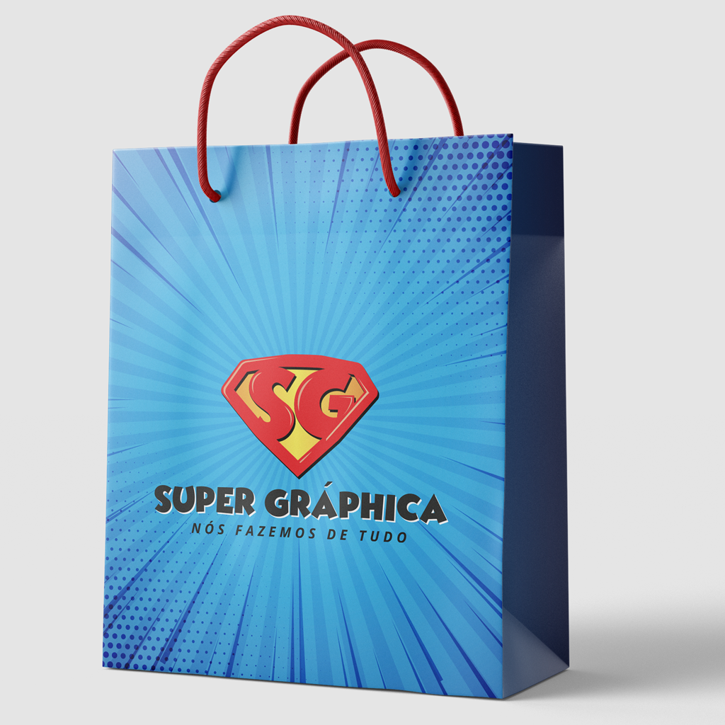 320x115x245mm em Duplex 190g – 4×0 – Laminação Fosca Frente – Faca Padrão com Alça Nylon Branca 35cm com Ponteira